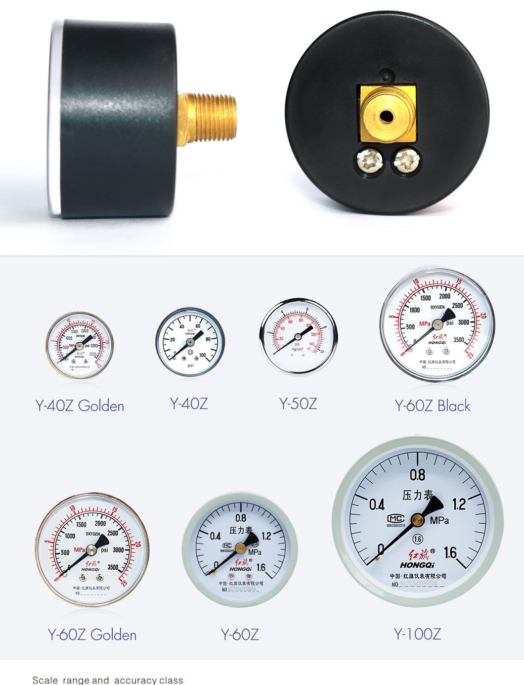 The pressure gauge can be applied for those gaseous, liquid or vaporous media which don' t explode, crystallize and freeze, and corrode stainless copper or copper alloy. It adopts helical case, standardized copper connector, broadened bourdon tube, stainless steel movement and strengthened link. In order to ensure accuracy class, advanced equipment and technique are used in the process of calibration and testing. It is characterized by good appearance, high precision, small distance after tapping, good repetition and long service life. Hongqi Instrument (Changxing) Co., Itd has put into operation. Thanks to efforts of 15 offices and more than 100 agents, our products are popular across the country, and are exported to over 10 Mid-East and Euro-American countries and regions. In 2000, we were recognized as enterprise name without administrative divisions by state administration for industry and commerce, and can do import and export business.